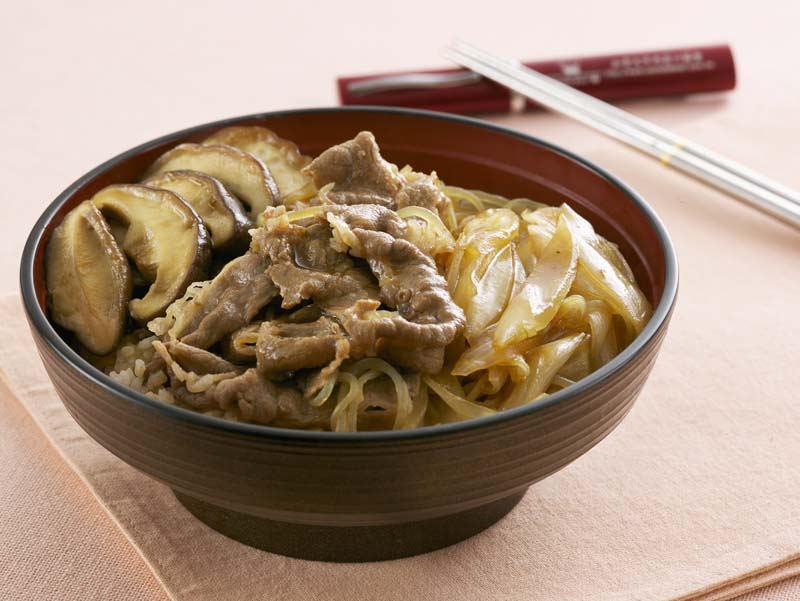 200 gram thịt bò Canada lát thịt xông khói, 4 nấm hương tươi, 8 cuộn konjac, 1 chén hành tây thái sợi, 2 bát cơm trắng